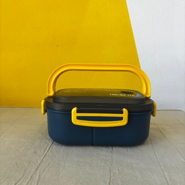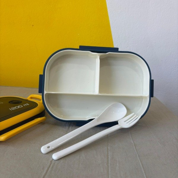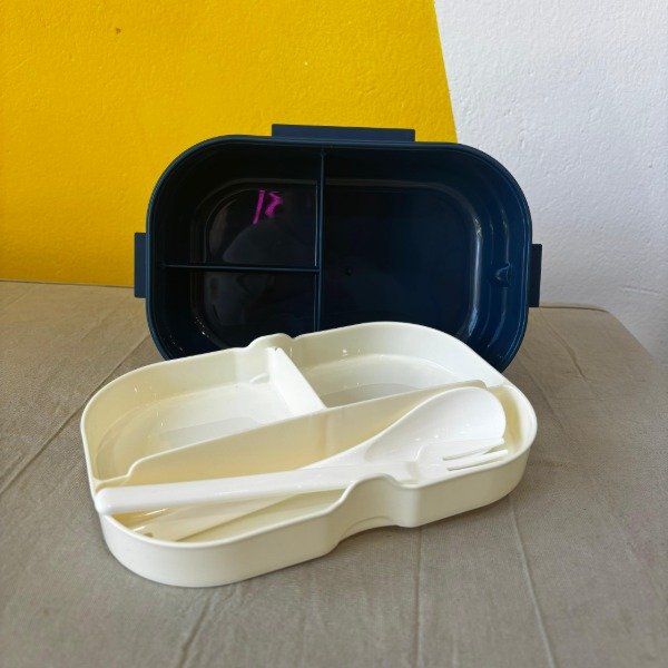 Lunchera valija plástica doble piso y 3 divisiones. Incluye cubiertos.